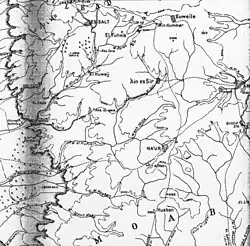 Before Haifa was captured by the 14th Cavalry Brigade (5th Cavalry Division) on 23 September, Chaytor's Force had crossed the Jordan River to climb to the Plateau of Moab and Gilead on their way to capture Es Salt.[39][40] An extensive rearguard position, defended by nine officers and 150 other ranks with rifles and machine guns, across the road from Damieh to Es Salt had been attacked and outflanked by the Canterbury Mounted Rifles Regiment advance guard. All defenders were captured, and at 16:20 on 23 September, Es Salt was occupied by the New Zealand Mounted Rifles Brigade.[29][36][41][42]