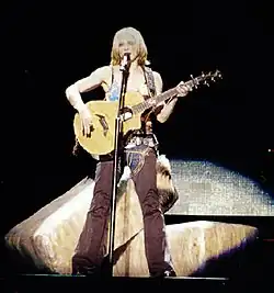 On February 18, 1995, Madonna arrived in Europe to promote Bedtime Stories; that same day, she appeared on German TV show Wetten, dass..?, where she was interviewed and performed "Secret" and "Take a Bow".[82] "Secret" was performed on Madonna's 2001 Drowned World Tour, during the cowgirl section of the show.[83] The performance was accompanied by a video montage of riverside baptism, whirling dervishes ceremonies and Buddhist prayers; the footage was taken from McDaniel's film which had inspired Madonna for the performance as well as enlisting her.[83][76][84] Alexis Petridis of The Guardian called the performance "a gorgeous acoustic reading."[85] Writing for The Victoria Advocate, Steve Dollar praised the performance, saying that the song "has grown in depth" over time.[86] During the New York City performance of "Secret", she dedicated the song to its inhabitants.[87] The performance of the song on August 26, 2001, at The Palace of Auburn Hills was recorded and released in the live video album, Drowned World Tour 2001.[88]