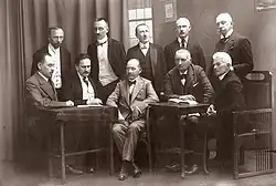 ![]() Senate of the Secret Ukrainian University in 1921. Sitting, from left: Myron Korduba, Marian Panchyshyn, Vasyl Shchurat, Ivan Kurovets, Maksym Levytskyi. Standing: Ivan Rakovskyi, Volodymyr Verhanovskyi, Roman Kovshevych, Maksym Muzyka, Myron Vakhnianin | |