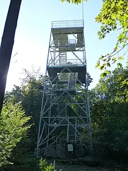 In 1914 the Selberg Club from Rothselberg erected a wooden viewing tower and log cabin on the summit. The wooden tower was replaced in 1969 by a 17.3-metre-high[2] steel tower. Forty eight steps lead via two landings to a platform, 9.6 metres above ground level,[2] and another 32 steps to a viewing platform at a height of 16 metres,[2] from which there is a good panoramic view. The Selber Hut has been converted and expanded several times; it is open on Sundays.