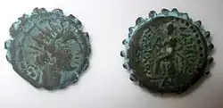 One theory is that the serrated edge made it easier to prove that the coin was solid metal. However, only the Seleucid bronze coinage, rather than coins of gold and silver, feature this sort of an edge.[19] Certain Roman serrated denarii were especially designed to be harder to counterfeit or debase. However, the Roman efforts probably failed since there are silver plated copper denarii in existence. Seleucids are believed to not have serrated their coins as an anti-counterfeiting measure.[20] Syrian mints serrated their coins simply as a decorative method, and it is also possible that the Romans also sought only the aesthetic value.[9]