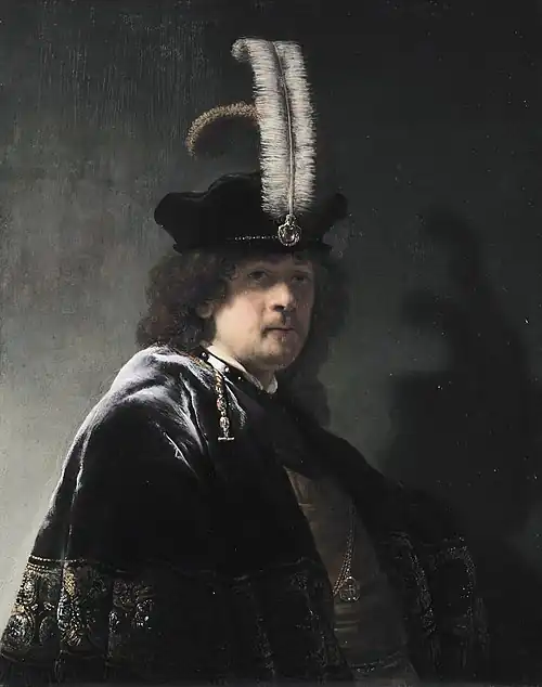 Self-portrait wearing a white feathered bonnet is an oil painting attributed to the Dutch painter Rembrandt. It is signed and dated 1635.[1] It was traditionally regarded as a Rembrandt self-portrait until 1968, when it was rejected on stylistic grounds in the Rembrandt catalogue raisonné by Horst Gerson. In 2013, art historian Ernst van de Wetering re-attributed the painting as an original Rembrandt. It is one of over 40 painted self-portraits by Rembrandt.[2]