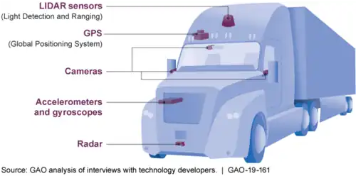 Sensors, such as Lidar, radar, cameras, ultrasonic, and GPS, are crucial to self-driving technology.[38] Due to different sensors performing best at different functions required for autonomous driving and the financial and technological challenges associated with relying on only one sensor, a successful self-driving truck system will likely feature many.[39]