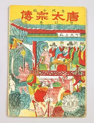 There is scholarly consensus that the Semin-hwangje bon-puri is a shamanic adaptation of the Tale of Tang Taizong (Korean 당태종전/唐太宗傳 Dang Taejong Jeon),[22][24] a Korean-language Buddhist novel of unclear date which was itself inspired by the tenth to twelfth chapters of the sixteenth-century Chinese novel Journey to the West, in which Emperor Taizong dies but is granted twenty more years of life by the gods of the afterlife.[25] Indeed, the overall narrative of the Bak Bong-chun version is effectively identical to that of the novel.[8] The fact that Jo's 1960s version diverges much more from the Buddhist original than Bak's 1930s version may reflect diachronic changes as the narrative increasingly shed its Buddhist origins before ultimately being lost.[26]