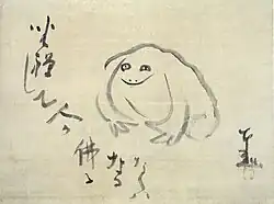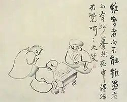 Sengai Gibon (仙厓 義梵; 1750–1837) was a Japanese monk of the Rinzai school (one of three main schools of Zen Buddhism in Japan, the others being the Sōtō school and the much smaller Ōbaku school). He was known for his controversial teachings and writings, as well as for his lighthearted sumi-e paintings. After spending half of his life in Nagata near Yokohama, he secluded himself in Shōfuku-ji in Fukuoka, the first Zen temple in Japan, where he spent the rest of his life.