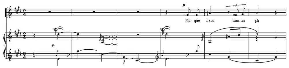 A characteristic modulation, quoted in Delage's In morte di un samouraï of 1950,[29] caught Flothuis's attention. At the beginning of "L'été ..." the first two chords have a double false relation (of C♭ to B♭, and G♭ to G♮) followed by an insistent fourth in the bass, which Flothuis interprets as "a double pedal point (B♭ + E♭)".[n][28] This evokes the distant beating of the temple bell and is heard twelve times in just nine measures, always off-beat of the melody: