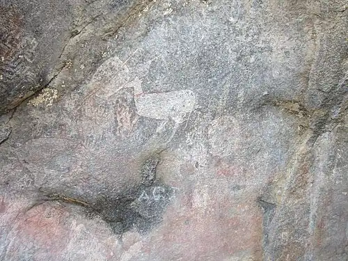 Only one human figure is found in this large scene of animals. The nose of the human is drawn in the same style as seen in Kilvalai rock paintings, but without a dagger. Based on the execution of paintings and the style of the figures, the date of these paintings is estimated at 1500 B.C.E.[3]