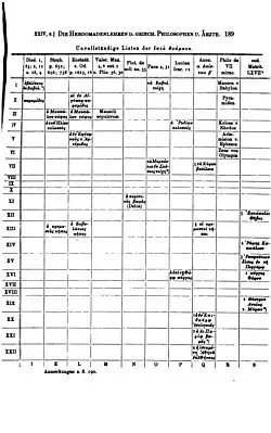 - ^ Roscher 1906, p. 187, 191: "Suchen wir uns jetzt einen Überblick über die hierfür in Betracht kommenden Zeugnisse der Schriftsteller zu verschaffen, so stellt sich freilich alsbald heraus, wie schwankend und unsicher die Ansichten von der Zugehörigkeit gar mancher θεάματα zu der Siebenergruppe waren, insofern im ganzen mindestens 22 verschiedene Bau- und Kunstwerke darauf Anspruch erhoben, zu jener Gruppe zu gehören, während es nur wenigen gelang, sich in allen oder doch der Mehrzahl der erhaltenen Listen zu behaupten, viele von ihnen sogar sich damit begnügen mußten, nur in einer einzigen Liste oder in zweien derselben zu figurieren. Offenbar hat in dieser Beziehung große Willkür geherrscht und insbesondere ein stark ausgeprägter Lokalpatriotismus einen bedeutenden Einfluß geübt; aber gerade jene Willkür im einzelnen gegenüber der so gut wie immer streng festgehaltenen Siebenzahl zeigt, welch außerordentliches Ansehen gerade diese Zahl im damaligen Zeitalter genoß. Die sämtlichen mir bekannt gewordenen vollständigen und unvollständigen Listen der sieben Wunderwerke habe ich in den beiden vergleichenden Tabellen auf S. 188 und S. 189 zusammengestellt... Beide Tabellen enthalten zusammen 18 Listen, die mit ganz wenigen Ausnahmen mehr oder weniger starke Abweichungen aufweisen; als völlig miteinander identisch können wir mit Sicherheit nur zwei (A u. F) betrachten, was sich ohne Zweifel aus der Tatsache erklärt, daß Gregor v. Nazianz entweder das Epigramm des Antipater v. Sidon oder dieselbe Liste wie dieser benutzt hat... Ferner beobachten wir, daß nicht weniger als 52 von den 82 von uns aufgeführten Erwähnungen der θεάματα wenn wir das unmittelbar an der Küste Asiens gelegene Rhodos wie billig mit zu diesem Weltteile rechnen sich auf asiatische Bau- und Kunstwerke, dagegen bloß je 14 von ihnen auf ägyptische und griechische und nur 2 (offenbar späteren Listen angehörige) auf Rom (Kapitol) beziehen."