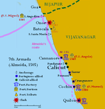 Manuel I designated D. Francisco de Almeida as captain-major of the 7th Armada, with the obligation to remain in India for three years. He would only be allowed to assume the title of 'Vice-Roy' upon the construction of four crown fortresses in India at Anjediva, Cannanore, Cochin and Quilon.[4]