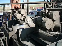 - Feeder - The feeder is essentially a collection pan for the drilling fluid before it is processed by the shaker, it can come in many different shapes and sizes to accommodate the needs of the mud system. The most commonly used feeder is known as the weir feeder, the drilling fluid enters the feeder usually through a pipe welded to the outside wall near the bottom of the feeder tank, it fills the feeder to a predetermined point and like water flowing over a dam the mud (drilling fluid) spills over the weir and onto the screening area of the shaker. This method of feeding the shaker is most widely used due to its ability to evenly distribute the mud along the entire width of the shaker allowing for maximum use of the shaker's screening deck area.