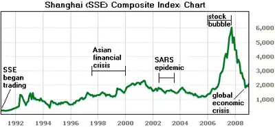 - 2007 – 2008 – A "stock market frenzy" as speculative traders rush into the market, making China's stock exchange temporarily the world's second largest in terms of turnover.[17][18] After reaching an all-time high of 6,124.044 points on October 16, 2007,[19] the benchmark Shanghai Composite Index ended 2008 down a record 65%[20] mainly due to the impact of the global economic crisis which started in mid-2008.