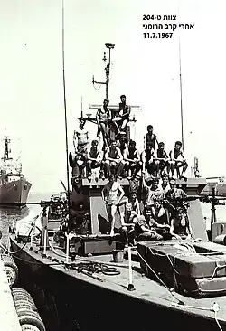The assault on Sharm el-Sheikh was to be carried out by paratroopers but as it was not clear whether the Egyptian artillery position in the area which was weak was manned or not. So torpedoes had to accompany the assault. When the torpedoes reached there it became evident that the positions were deserted. So the personnel of the torpedoes themselves took control and hoisted the Israeli flag.[15] So the Paratrooper assault was cancelled and forces were transported via helicopters. Furthermore, two Egyptian commando vessels were spotted by the torpedoes after capturing Sharm el-Sheikh, the vessels were unarmed but carried 33 commandos who were taken captive.[16]