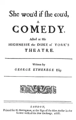 She Would If She Could is a 1668 comedy play by the English writer George Etherege. It was originally staged at the Lincoln's Inn Fields Theatre by the Duke's Company. The play's novelty lies in its shedding of the romantic verse element to attain a unified tone.[1] The play deals with the lustfulness of Cockwood couple; the title referring to Lady Cockwood looking for an opportunity to cheat Sir Oliver Cockwood.