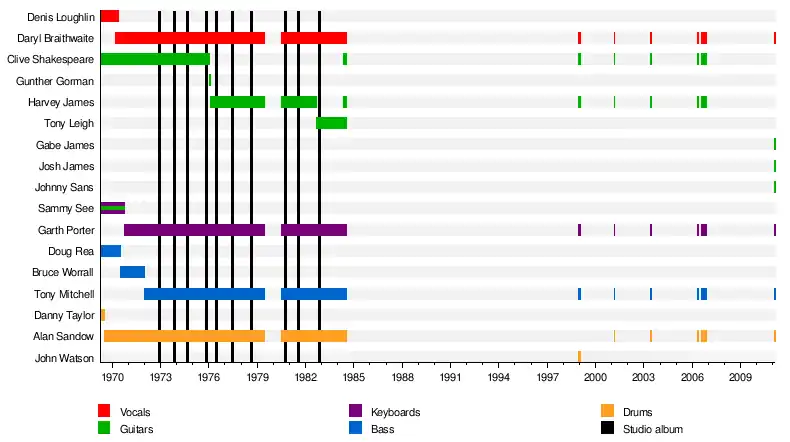 On 15 February 2012 Clive Shakespeare died of prostate cancer.[34][35] Founding vocalist Denis Loughlin (28 July 1949 – 23 January 2019) died after contracting cancer.[36][37]