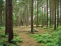 The forest was part of ancient Sherwood Forest, originally called Clipstone Heath it was replanted with pine trees by Forestry England and renamed Sherwood Pines.[2] There are the remains of Mansfield's 18th century main coach road leading to the Great North Road, and a medieval route from Kings Clipstone to Bilsthorpe, some of the medieval heath land and shroggs survive. Ancient boundary markers remain such as Robin Hood's Whetstone. There are the remains of a First World War pistol range and training trench. In 1630 the area was dominated by rabbit warrens. Feeding by the large number of rabbits had caused the land to become scrubby and in the Victorian era rabbits were killed and sent daily to London by train.[2] Forestry England was set up by the government in 1919 in response to a shortage of wood and in 1925 they obtained a 999-year lease at the park to plant and harvest trees.[2]