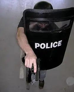 Tactical shields often have a firing port so that the officer holding the shield can fire a weapon while being protected by the shield, and they often have a bulletproof glass viewing port. They are typically employed by specialist police, such as SWAT teams in high risk entry and siege scenarios, such as hostage rescue and breaching gang compounds, as well as in antiterrorism operations.