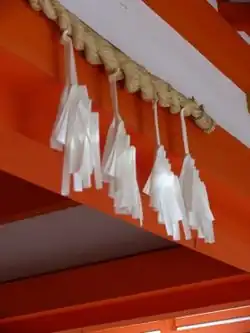 Heihaku (also called mitegura or heimotsu), a vertical wooden stick decorated with shide, cloth or metal called gohei, usually in red or white, which is used priests in Shinto.[4] People put heihaku in front of honden doors.[4] In a procession called shinkō-shiki , heihaku are seen as a sacrifice for the gods or a symbol of the existence of the gods.[4] In ancient times, people offered cloth to the Shinto shrines, similarly to today's processions.[4] Heihaku are also sometimes used in the way shide are.[4] The stripes can also hang on the shimenawa.[4]