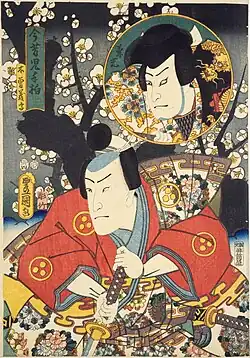 Inspired by the love romance between Yoshitaka and Ōhime, there are many works featuring Yoshitaka, including, for example, A Tale of Kiso Yoshitaka (or Shimizu no kanja) in Otogi-zōshi, Raigōajarikaisoden by Takizawa Bakin, and some Noh songs.[1][11] They are written based on historical sources like Azuma kagami.[11][9] One of the Noh songs Shimizu kaja was made during Muromachi era.[13] Yoshitaka has been interpreted to be handsome by posterity.[6]