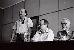 ![]() Shin Shalom (standing) with Asher Barash (centre) and Nahum Slouschz (right), photographed during a Hebrew writers' conference in 1948 | |