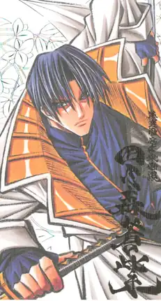 Shinomori Aoshi is a ninja of the Oniwaban, who worked for the Shogunate government during the Edo period.[ch. 16] At the suggestion of Kashiwazaki Nenji (better known as Okina), Shinomori was given the position of Okashira at the age of fifteen, in time for the Oniwabanshou to defend Edo Castle.[14] As a member of the Oniwabanshuu, he helped to raise Makimachi Misao from childhood. Misao, who was his protegee developed a strong admiration and romantic feelings for him. Aoshi is a grandmaster and Okashira of the Oniwanbanshou shinobi. Aoshi's weapon of choice is a kodachi, a sword that is described in the series to act like a shield because its light weight makes it easy to block with. He originally used only one of these short swords for defense and relied mainly on kenpo for his offense, but later used a two-sworded style.[15] Among several from his Kodachi nito Ryu, the Kaiten Kenbu Rokuren (回天剣舞・六連(かいてんけんぶ・ろくれん); "Spinning-Heavenly Sword-Dance Six-Series" or "The Dance Of The Wheeling Sword Six Successions") is the strongest.[16] After the revolution, since a few members of the Oniwabanshū were unable to adapt to life in the Meiji era, Aoshi and these members worked for the corrupt, power-hungry business man, Takeda Kanryū instead.[17] During the early chapters of the manga, the Oniwabanshū work to capture doctor Takani Megumi under orders from Kanryu for his opium business.[18] This leads them to clash with Kenshin and his allies. As the oniwaban are defeated by Kenshin and his friends, Kanryu betrays them and tries to kill them. Aoshi is the only survivor who escapes to become stronger to kill Kenshin and obtain the title of the strongest in favor of his dead subordinates.[19]