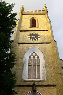 The building was also described in 1848 as "a handsome structure in the later English style, with a square embattled tower".[2]