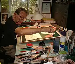 Shemuel Katz's artworks have been exhibited extensively in Israel and abroad. His watercolors of Jerusalem have been reproduced as posters and postcards. His courtroom sketches of Adolf Eichmann's trial in Jerusalem, 1961, are held in the art collection of Yad Vashem, Israel's Holocaust Remembrance Authority. As an artist in the IDF, he sketched soldiers on guard and at war. Katz is well known as the illustrator of hundreds of books, especially for Sifriat Poalim, the Kibbutz Artzi movement's publishing house. Especially popular are his illustrated classics of Israeli children's literature, such as Igeal Mozinsohn's Hasamba series and poet Leah Goldberg's Room for Rent,[2][3] whose cover art was used for a postage stamp.[4]