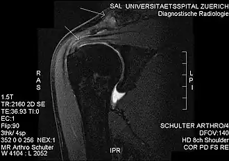 Plain x-rays of the shoulder can be used to detect some joint pathology and variations in the bones, including acromioclavicular arthritis, variations in the acromion, and calcification. However, x-rays do not allow visualization of soft tissue and thus hold a low diagnostic value.[2] Ultrasonography, arthrography and MRI can be used to detect rotator cuff muscle pathology. MRI is the best imaging test prior to arthroscopic surgery.[2] Due to lack of understanding of the pathoaetiology, and lack of diagnostic accuracy in the assessment process by many physicians,[21] several opinions are recommended before intervention.