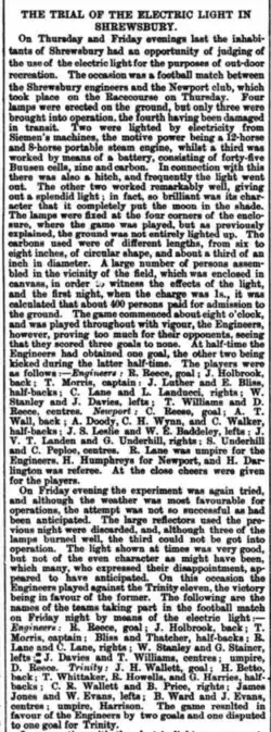 - ^ "The trial of the eletric light in Shrewsbury". Eddowes' Shrewsbury Journal: 9. 18 December 1878.