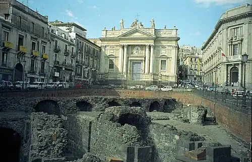 Two important Christian inscriptions have been discovered from the period. One is the Epitaph of Julia Florentina, discovered at Catania in 1730 (in the necropolis on the site of the modern via Dottor Consoli) and now in the Louvre in Paris. It is a funerary inscription, dating to the end of the 3rd century AD at the earliest, which records in Latin the death of a child of little more than a year in age, buried next to the "Christian martyrs" (but it is not clear whether this refers to Agatha and Euplius). The inscription is the first direct evidence for Christianity on the island. The other inscription, also sepulchral, is the so-called Inscription of Euskia in Greek, which was discovered at the end of the 19th century in the Catacombs of San Giovanni in Syracuse and is now housed in the Museo archeologico regionale Paolo Orsi. The grave stele indicates a local cult of Lucy at the beginning of the 5th century.[69] At the time of the inscription's creation, the cult of Agatha is already attested at Rome and Carthage.[70]