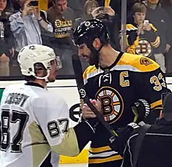 On June 28, 2012, the Penguins announced that Crosby agreed to a 12-year, $104.4 million contract extension set to keep Crosby in Pittsburgh through to the end of the 2024–25 NHL season.[94] The start of the 2012–13 season was postponed until January 2013 due to the owners locking out the players as negotiations took place to solidify a new collective agreement for the players. During this time, Crosby was a regular attendee of meetings taking place between National Hockey League Players' Association (NHLPA) representatives and NHL owners. The lock-out began on September 15, 2012, and ended on January 6, 2013, with the NHL regular season beginning on January 19.[95] During the 119-day lock-out, Crosby was often questioned about his future plans should the lockout persist, and said on more than one occasion that he was considering contract offers from various teams in European leagues (where many NHL players went so that they could continue playing in a professional capacity while waiting for the lock-out to end or for the NHL season to be officially cancelled). Crosby continued to practice and participated with other NHL players who did not go overseas in several exhibition games open to the public.[96] With the season finally underway in January 2013, Crosby set the pace for scoring, totalling 31 points (nine goals and 22 assists) through the first 21 games. He remained hot through March, scoring another 25 points (six goals and 19 assists) in 15 games as the Penguins went unbeaten over this stretch. However, his regular season came to an abrupt end on March 30 in a home game against the New York Islanders. Crosby's teammate Brooks Orpik unleashed a slapshot which caught Crosby in the mouth, causing the centreman to lose several teeth. Crosby was down on the ice for several minutes before the medical staff was able to help him to the dressing room with Crosby holding a towel over his face. Initially, the prognosis was not severe, but it was discovered a short while later that Crosby had broken his jaw and would require several rounds of reconstructive dental surgery.[97] He missed the final 12 games of the regular season and finished fourth in the scoring race, losing the title to Tampa Bay's Martin St. Louis by four points.[98] Crosby returned to the ice May 5 for the Penguins' second game against their first-round playoff opponents, the New York Islanders, ironically, the team who Pittsburgh played when Crosby was injured weeks prior. Despite two goals from Crosby, Pittsburgh lost 3–2, tying the series at one game apiece.[99] The top-seeded Penguins would ultimately prevail 4–2 in the series over the eighth-seeded Islanders with Crosby scoring nine points (three goals and six assists) in the five games in which he played.[100] Crosby and the Penguins moved on to face the Ottawa Senators in the second round, with Crosby scoring a hat-trick in game two of the series. Pittsburgh quickly defeated Ottawa four games to one in the series with a still-hot Crosby finishing the series with four goals and two assists. The Eastern Conference finals came down to what many felt were the two best teams in the conference: Pittsburgh and Boston Bruins goaltender Tuukka Rask put on an outstanding performance, shutting down Pittsburgh's potent offence with the help of a stifling defensive effort from his teammates. The Penguins were held to just two goals in the series, with Rask stopping 134 of 136 shots on goal (.985%). Crosby, who was strong for the Penguins in the regular season and through the first two rounds of the playoffs was held off the score sheet entirely, finishing the series with no goals and no assists on 13 shots within the four games as the Bruins swept the Penguins in four-straight games.[101] In the off-season, Crosby was awarded his second Ted Lindsay Award and finished as runner-up to the Hart Memorial Trophy and Bill Masterton Memorial Trophy.[102]