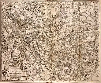 Situation remained quite for four years. In 1614, however, the Count Palatine of Neuburg converted to Catholicism and drove the Brandenburger troops of Düsseldorf. This time, the Spanish Army intervened on his side. Spinola moved out from Maastrich in late August and, in a swift campaign, occupied the rebellious Free Imperial City of Aachen, supported by Brandenburg, 10 towns and villages in Cleves, including Wesel, 28 in Jülich, and 24 in Berg and Mark.[10] The Dutch reacted by garrisoning 70 infantry companies in other towns and villages in Jülich, Cleves and Mark –including Emmerich and Rees– in order to cut the Spanish lines of communications between the Rhineland and the towns seized in 1605–1606 in the Achterhoek and Twente.[11] Open was averted through negotiation, but the situation remained tense, especially as both sides bolstered their position by seizing new towns. In 1616, Spinola occupied Soest, while in 1620, Maurice, who had sized power in the Republic after toppling the pro-peace Grand Pensionary Oldenbarnevelt in 1618, sent troops up the Rhine to seize and fortify an island on the confluence of the said river and the Sieg.[12] The new fort was known as Papenbril or Pfaffenmütze (Monk's Spectaces or Monk's Cowl) and allowed the Dutch to intercept the traffic on the Rhine between Cologne and Bonn.[13]