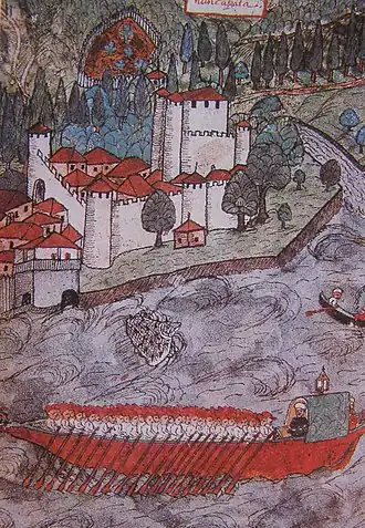 Meanwhile, Admiral Kasim Pasha had completed his work in Sinope and, assisted by a veteran seaman named Yakub, sailed to Trebizond. According to Chalkokondyles, upon reaching their destination the sailors disembarked, set fire to the suburbs, and began the investiture of the city.[34] However, Doukas states that despite daily assaults "no headway was made" to breaching the walls.[35] The men of Kasim Pasha's fleet had besieged the walls of Trebizond for 32 days when the first units of the Sultan's army under his Grand Vizier Mahmud Pasha Angelovic crossed over the Zigana Pass and took up positions at Skylolimne.[34]