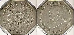 In 1964, decimal coins were introduced in denominations of 1⁄2, 1, 5, 10 and 20 cents. The coins size and compositions were based in part on those of the former colonial state British West Africa. All bore the portrait of the first prime minister of Sierra Leone, Sir Milton Margai. In 1972, 50 cents coins were introduced which carried the portrait of the first president Dr. Siaka Stevens.