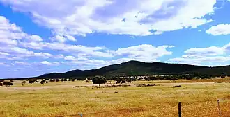 The Sierra de San Pedro is a range of low hills that stretches for over 60 km in a NW/SE direction. It is parallel to the Serra de São Mamede to the west in nearby Portugal and is relatively lower than the latter. The range is located between the towns of Arroyo de la Luz north of the range and Alburquerque to the south, and the N-630 road in the east and the towns of Membrio and San Vicente de Alcántara in the west. The Peña del Águila Dam on river Zapatón that supplies water to Alburquerque is located in the range.[3] A projection of the range stretching northwards from its western end is known as the Sierra de Carbajo, also named Sierra de Santiago, a small range located between Carbajo and Santiago de Alcántara.