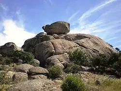 The slopes of this mountain are dotted with large rocks and granite outcrops, and covered with holm oaks, stone pines, oaks (Quercus pyrenaica), cork oaks, and Mediterranean shrubs, among which rockrose and broom stand out.[14]