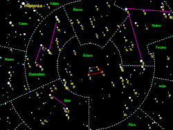 At magnitude +5.42, Sigma Octantis is barely visible to the naked eye, making it unusable for navigation, especially by comparison with the much brighter and more easily visible Polaris.[16] Because of this, the constellation Crux is often preferred for determining the position of the South Celestial Pole.[17] Once Sigma Octantis' approximate position has been determined, either by the major stars in Octans or using the Southern Cross (Crux) method, it can be positively verified using an asterism: Sigma, Chi, Tau, and Upsilon Octantis are all stars of around magnitude 5.6, and form the distinctive shape of a trapezoid.