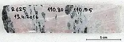 Phlogopite occurs as disseminated flakes, tabular crystals and lamellar or foliated aggregates. The grain size of the micas varies from only a couple of μm to several centimetres, the average size is 1–2 mm in diameter.[41] The phlogopite is altered into brown biotite-phlogopite in the shear zones, and in the most intensely sheared zones, into biotite and chlorite.[42] The most common inclusion mineral in micas is magnetite, but generally the inclusions are rare. Some zircon inclusions can also be found.[43]