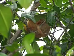 Some authors suggest the silky anteater usually dwells in silk cotton trees (genus Ceiba).[13] Because of its resemblance to the seed pod fibers of these trees, it can use the trees as camouflage[9] and avoid attacks of predators such as hawks and, especially, harpy eagles. During the day, they typically sleep curled up in a ball.[14] Although they are rarely seen in the forest, they can be found more easily when they are foraging on lianas at night.