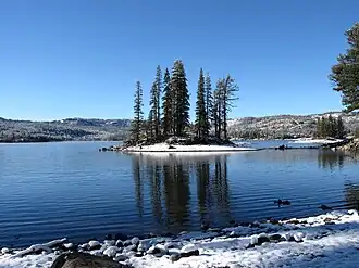 It is located within Amador County. It is about 20 mi (32 km) south of South Lake Tahoe and about 8 miles (13 km) west of Carson Pass.[2] The lake surface is 525 acres (212 ha) at full capacity and is at an elevation of 7,200 feet (2,200 m).[3] It is surrounded by Eldorado National Forest and is part of the El Dorado Irrigation District (EID) and their Hydroelectric Project 184 system.[4] Snow and ice are common in this area during winter seasons.