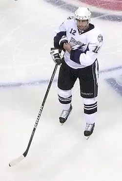 After just one season in Tampa Bay, Gagné became an unrestricted free agent. On July 2, 2011, he signed a two-year, $7 million contract with the Los Angeles Kings.[12] He scored his first goal as a Kings player on October 13, 2011, against Martin Brodeur of the New Jersey Devils. During the regular season, he appeared in 34 games and scored 10 goals with 17 points overall. On June 11, 2012, he won the Stanley Cup over the Devils, along with former Flyers teammates Jeff Carter and Mike Richards. During the Kings' playoff run, he appeared in four games but did not record a point. During the off-season, he underwent surgery to remove a 5 cm mass from his neck which had been causing him chronic pain.[13]