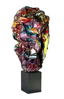Raab works in a new medium, he calls and patented as "Parleau" ("Parleaux" in the plural) which is French for 'through the water'.[1] The term suggests the quality of light passing through liquid. He uses large-format sheets of metal (aluminum or stainless steel) which he paints first and then forms and sculpts by hand. He creates wall-mounted paintings with embedded frames and freestanding volumetric sculptures.