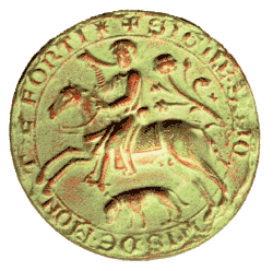 ![]() Seal of Simon de Montfort, depicting him riding a horse and blowing a hunting horn with a hound alongside, inscribed with his Latinised name: SIGILL[UM] SIMONIS DE MONTE FORTI ("seal of Simon from the strong mountain") | |