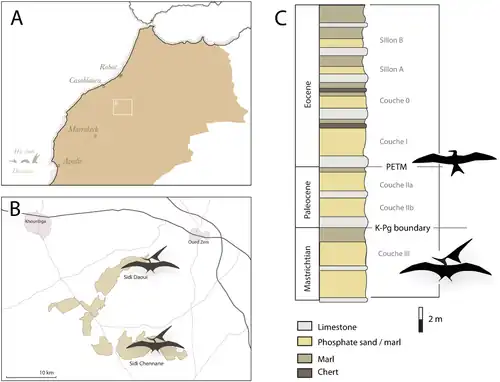 - ^ a b c d e f g h Longrich, Nicholas R.; Martill, David M.; Andres, Brian; Penny, David (2018). "Late Maastrichtian pterosaurs from North Africa and mass extinction of Pterosauria at the Cretaceous-Paleogene boundary". PLOS Biology. 16 (3): e2001663. doi:10.1371/journal.pbio.2001663. PMC 5849296. PMID 29534059.