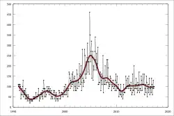 In 1995, the United Nations Department of Economic and Social Affairs reported that there were 29,812 people within the Singaporean Australian community, with students accounting for about 40% of population, as the Australian Census of 1996 recorded about 11,000 students from Singapore enrolled in universities in the country. By 1998, the population was estimated to have grown to 35,933 people.[2][8] With the increase in the population of Singaporeans in Australia, a number of Singaporean clubs and associations were set up to support the communities located across the country.[9]