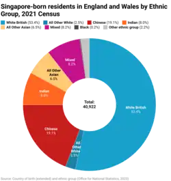 As Singapore is a multi-racial country, a Singaporean British could either be of Chinese, Malay, Indian, or Eurasian descent, the main races of Singapore. The 2021 census for England and Wales recorded the majority (53.4%) of usual residents who were born in Singapore identified as White British. 19.0% identified as Chinese and 8.0% identified as Indian.[4]