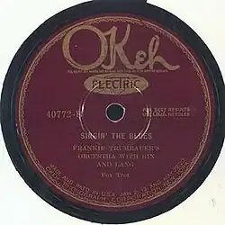 "Singin' the Blues" is a 1920 jazz composition by J. Russel Robinson, Con Conrad, Sam M. Lewis, and Joe Young. It was recorded by the Original Dixieland Jass Band in 1920 as an instrumental and released as a Victor 78 as part of a medley with "Margie". The song was released with lyrics by vocalist Aileen Stanley in 1920 on Victor. In 1927, Frank Trumbauer, Bix Beiderbecke, and Eddie Lang recorded and released the song as an Okeh 78. The Trumbauer recording is considered a jazz and pop standard, greatly contributing to Frank Trumbauer and Bix Beiderbecke's reputation and influence (it remained in print at least until the Second World War). It was one of the first jazz recordings inducted into the Grammy Hall of Fame. It is not related to the 1956 pop song "Singing the Blues" first recorded and released by Marty Robbins in 1956.