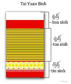- hua sinh (Lao: ຫົວສິ້ນ), literally 'the head of the sinh', is the waistband portion, which is typically tucked in and hidden.