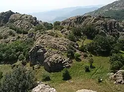 Due to the complex geological composition, the relief is highly dissected. Its lowest point is at an altitude of about 290 m; the highest point of is the summit of Bulgarka (1181 m), which is also the highest peak in the eastern Balkan Mountains.[2][4] The elevation increases northwards, with the northern section of the park being the highest, where the main ridge of the Sliven Mountain is located. The northern slopes of the mountain are very steep and difficult to access, and are covered with extensive beech forests. The southern reaches of the park are occupied by ravines and crevices with sparse vegetation, represented mainly by individual trees.[7] There are numerous caves, such as Zmeevi Dupki, Haydushkata Peshtera, Bachvata, Starite Dupki, etc.[2]