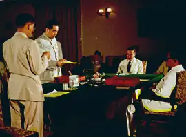 ![]() Zhou Enlai (standing, second from left) and Sunario (seated, right) meet at the 1955 Asian–African Conference. | |