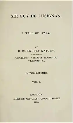 Sir Guy de Lusignan is an 1833 historical novel by the British written by the British author Cornelia Knight.[1] It was the final major work of the novelist best known for her 1792 novel Marcus Flaminius.[2] [3] It is set during Lord Edward's crusade to the Holy Land, led by the future Edward I of England.[4]